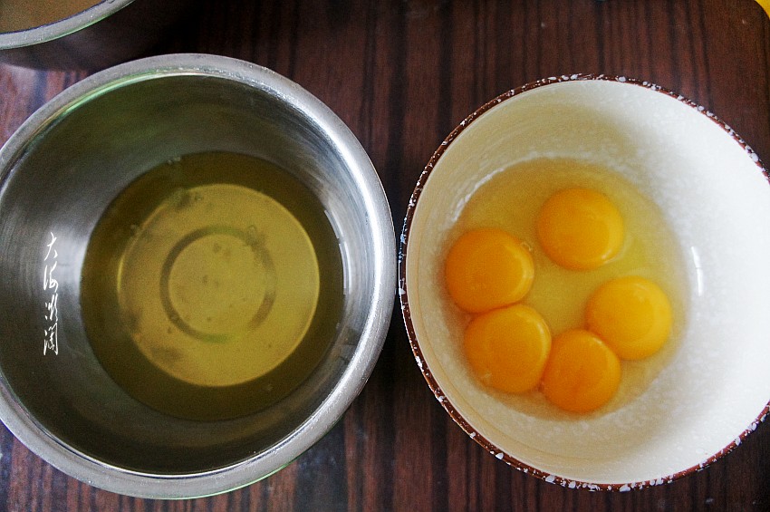 取两个盆,将4个鸡蛋蛋黄蛋清分离,另一个全蛋液打入蛋黄中。