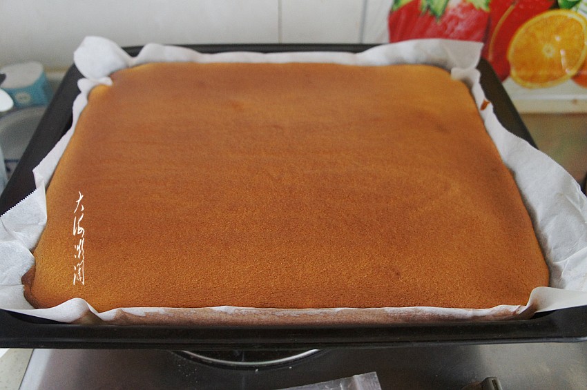 出炉立即脱离烤盘倒扣在烤网上,撕掉油纸再倒扣回来,虚盖一张油纸晾凉,降至微温。