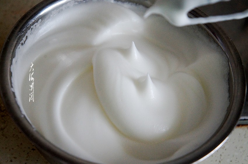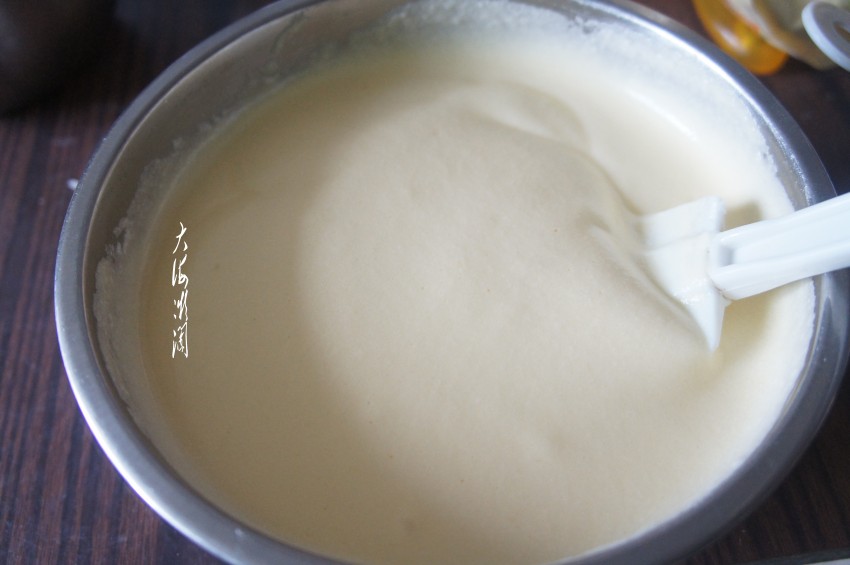 打发的蛋白分三次加入蛋黄液中,切拌均匀。切记是切半哦!