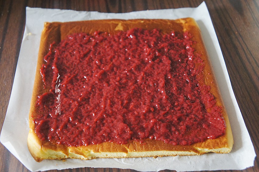 切掉2边,两头最好切斜面,樱桃果酱抹在降温后的蛋糕表面。借助擀面杖卷起蛋糕卷,直接用油纸包好,放入冰箱冷藏定型。