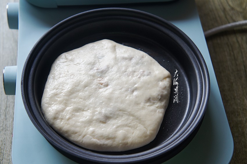 面很软,用手压一压就成饼了,也可以用擀面杖擀成圆饼,注意动作要轻,否则容易露馅。平底锅刷底油,放入馅饼,早餐机接通电源,开中火烙。