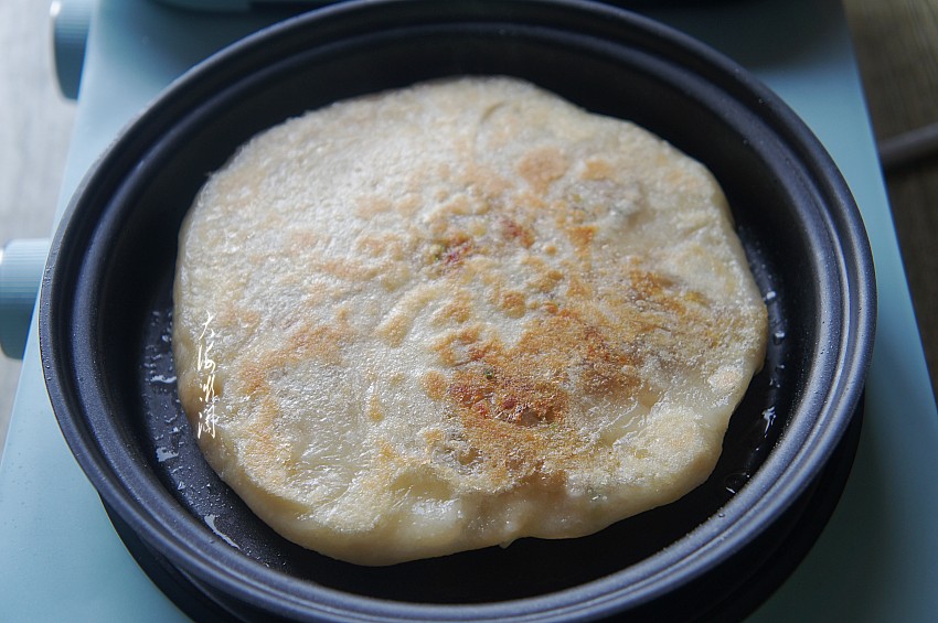 2、烙馅饼,底层焦脆后可加入适量的水,盖上锅盖焖1~2分钟,目的是让肉馅熟透,如果饼很薄这一步可省略,根据实际情况操作。