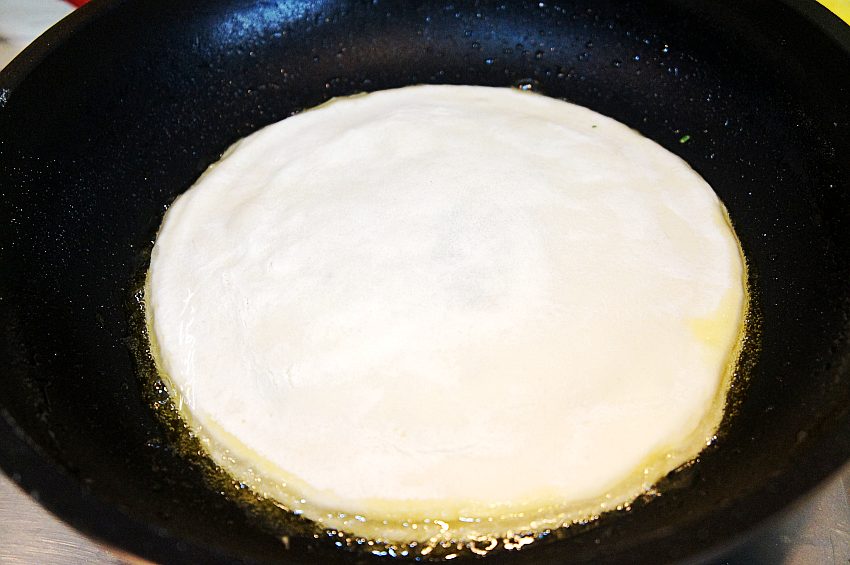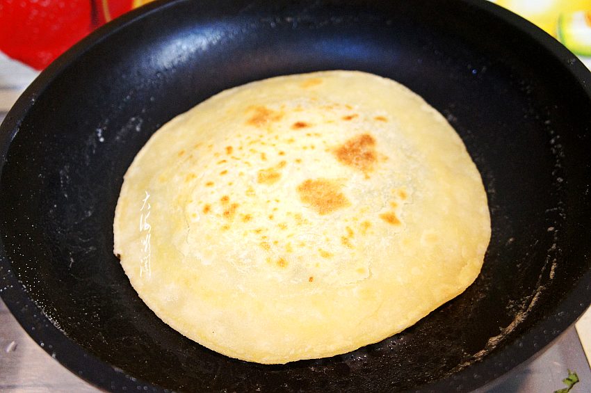 最好用平底锅烙,没有平底锅大勺也可以,平底锅中薄薄地刷一层油,盘中包好饼直接倒入锅中,小火烙。
