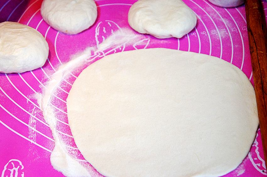 饧好的面团均匀的分成6个面剂子,取两个面剂子擀成薄饼,盘子底部撒点面粉,一张饼皮放在盘子中。