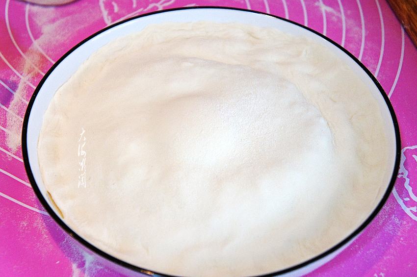 取另一张饼皮盖在上边,周边按实,也可以捏个花边,放在盘子里比较容易操作,而且可以直接扣入锅中,很方便。