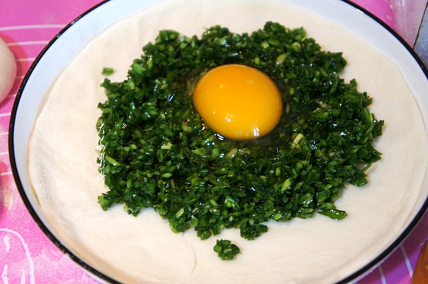 然后放入韭菜馅,再把韭菜馅向四周推一推,中间打入一个鸡蛋,尽量选择略小一点的鸡蛋好包,或者做大一点的盒子,我今天做的盒子就比较大,用的是大盘子,烙出来的韭菜盒子可以切4半,一个盒子足够一人吃了。