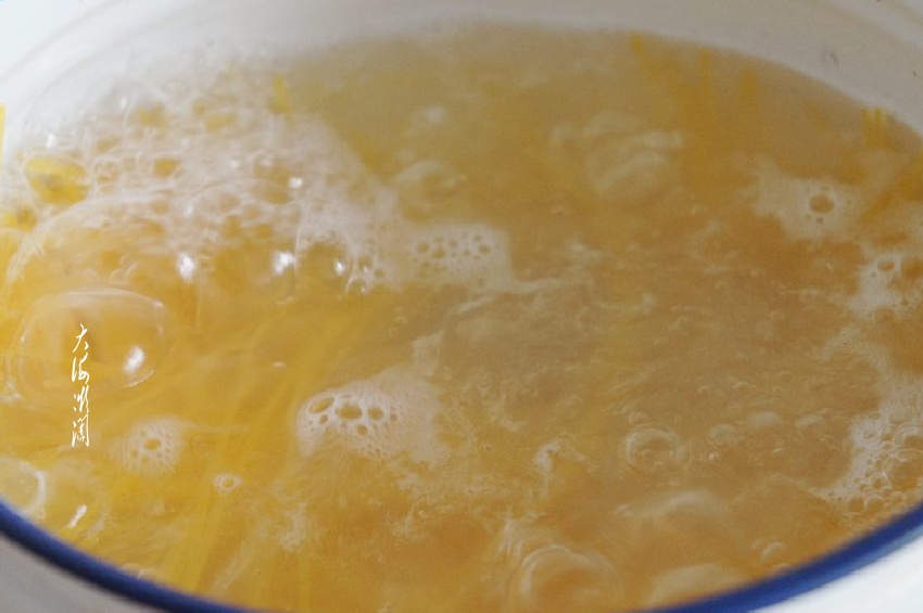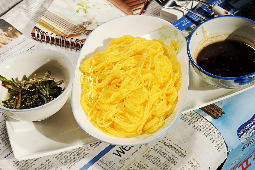 煮面,在炸葱油酱汁的同时,锅中加入适量的水,水开下入挂面,煮开加入冷水,再煮开,再次加入冷水,第三次煮开,面条煮的恰到好处,出锅。