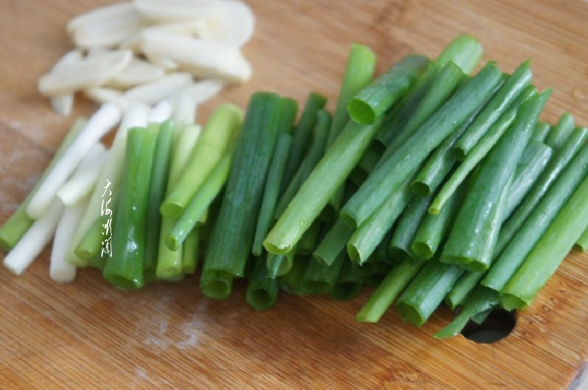 大蒜切片;香葱切段,香葱可以多放点,要把香葱炸出葱香味才好吃。