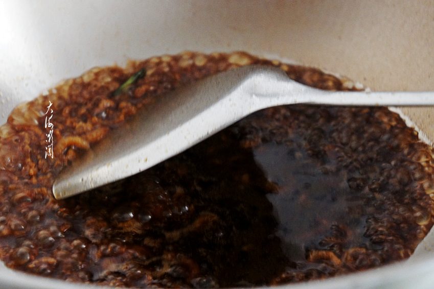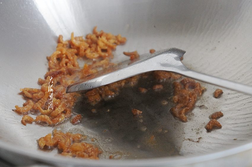 锅里留底油,放入干虾仁,稍微煸炒一下。