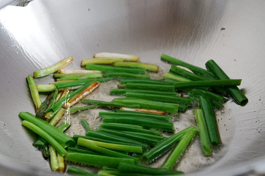 炒锅加入适量的油,放入蒜片小火煎香,然后把蒜片捞出去扔掉,留底油。先放入葱白翻炒,最后放入葱叶子,小火继续煎至香葱略焦,倒出葱油。