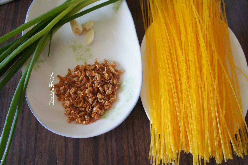 准备食材:小葱去皮洗净,大蒜去皮洗净,干虾仁冷水洗净,冷水浸泡一下。黄色的玉米挂面看着就很诱人吧,煮出来特别劲道。