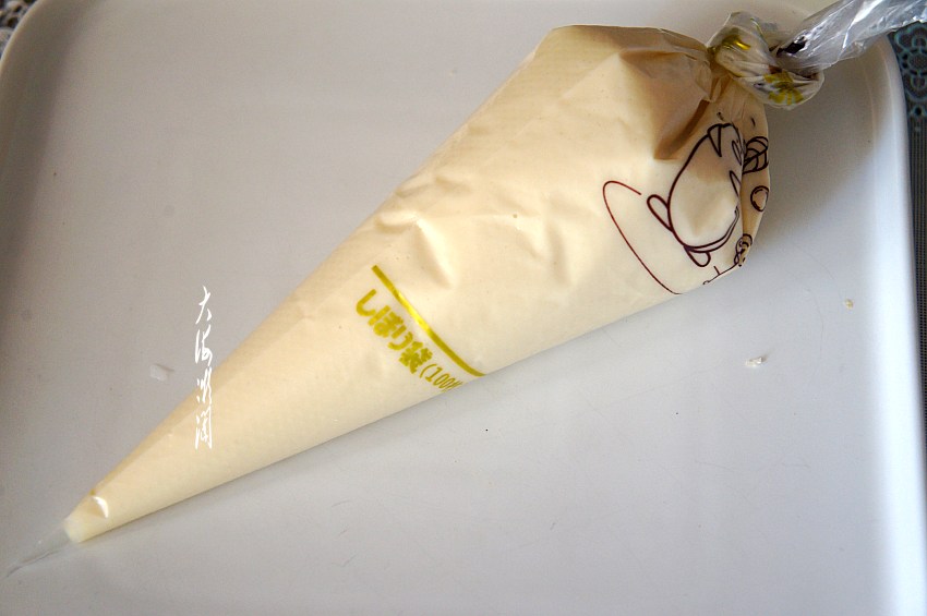 将面糊倒进裱花袋,在裱花袋尖部剪一个足够小的孔,能滴落面糊形成细线即可。