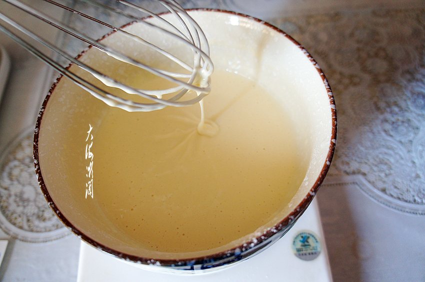 最后的面糊状态,提起蛋抽,液体顺滑流淌,落到碗中能保持2秒钟不散即可。如果干了,可以少许加点奶,面糊稀了少许加点低筋粉,切记一点一点加,别加多了。