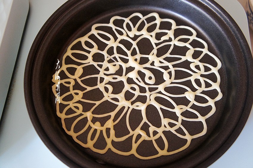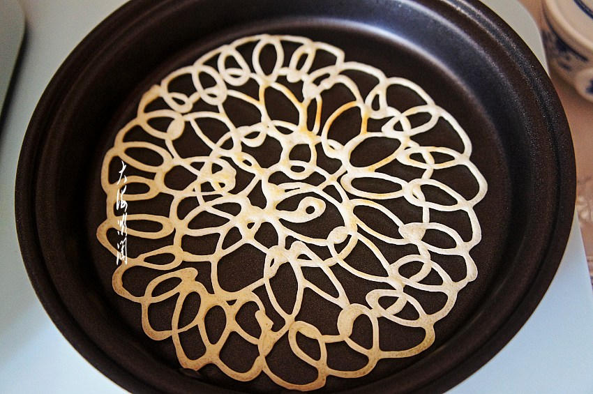 平底不粘锅,不用刷油,如果没有平底不粘锅,非不粘锅的小伙伴可以薄薄地刷油防粘,蛋液挤满后,可以在中间或是觉得花纹较稀的地方随意的补一点,只要铺满就好了,小火煎。