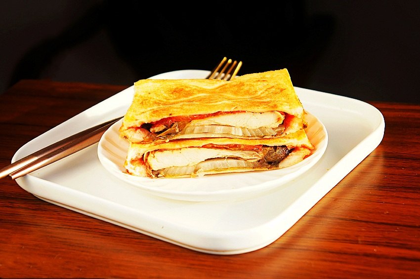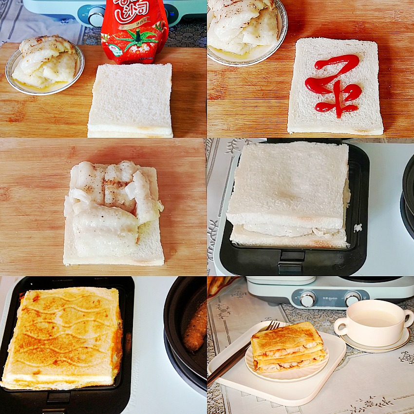 4、5分钟时间到,取出压好的鸡胸肉三明治。无肉不欢的小朋友特别爱吃。