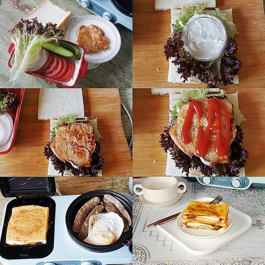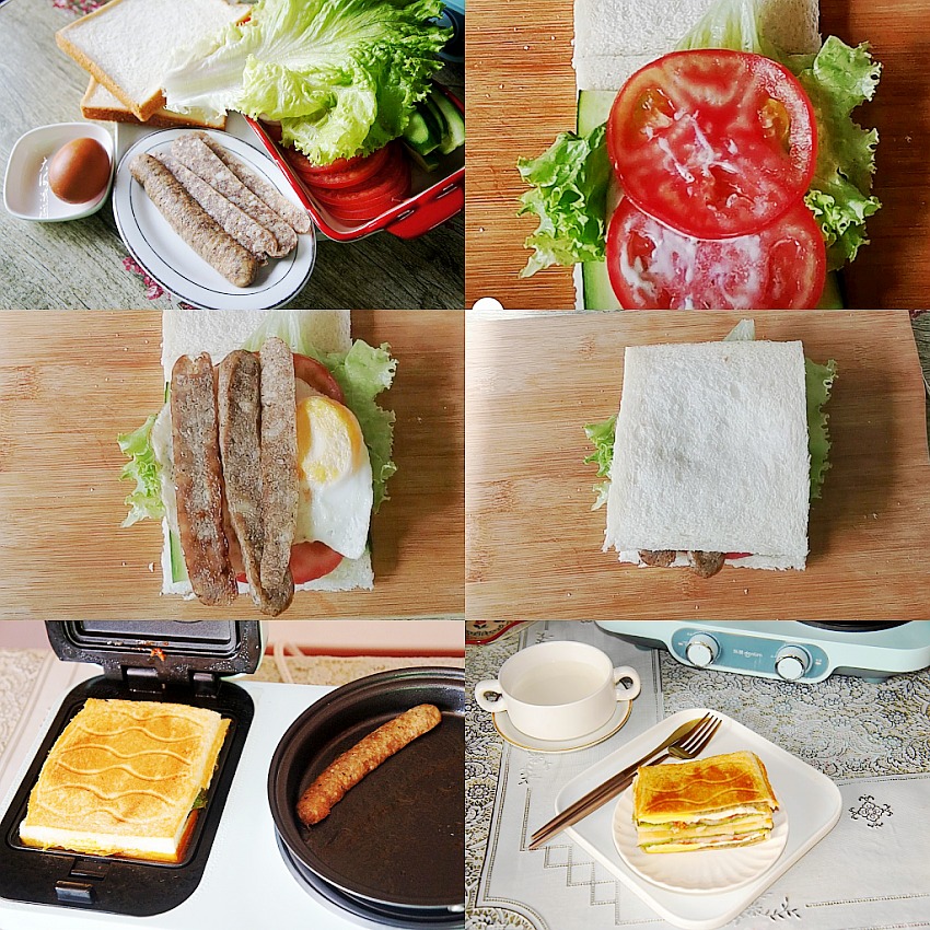 4、5分钟时间到,取出压好的三明治。孩子爱吃的黑椒牛肉肠三明治准备好了。