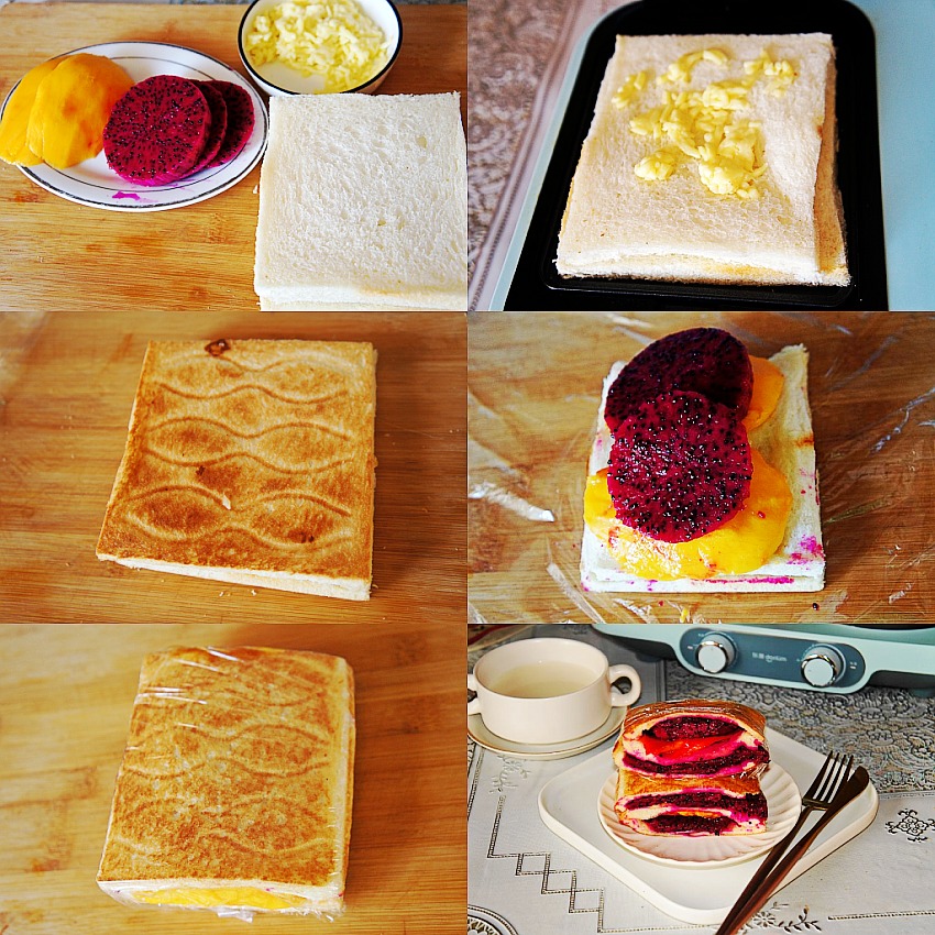 食材:吐司3片;芒果1个;红心火龙果1个;马苏里拉适量。