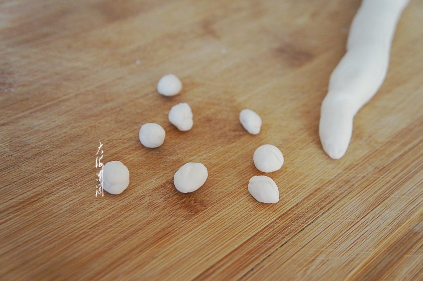 饧好的面团揉成细长条,切或者揪成小小的面剂子滚圆,是否均匀不重要,相对要小一点点。