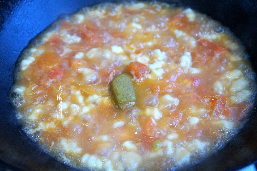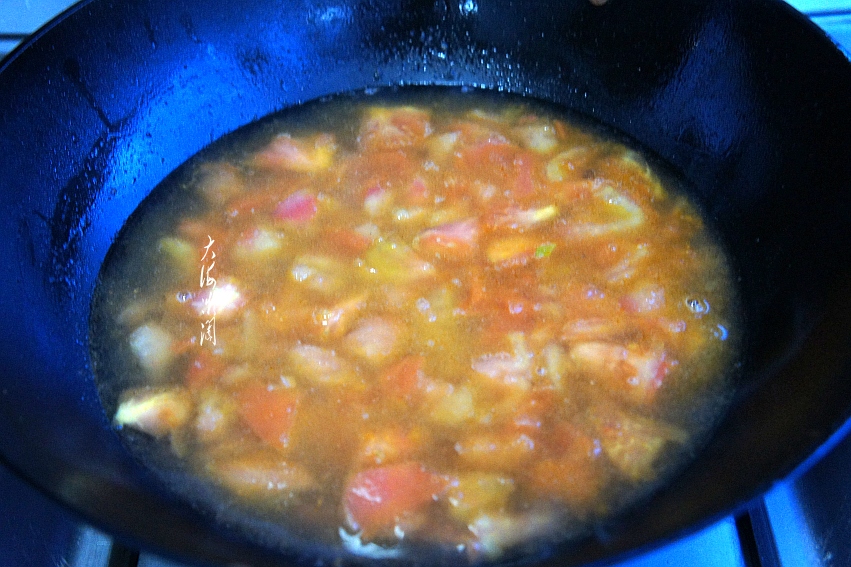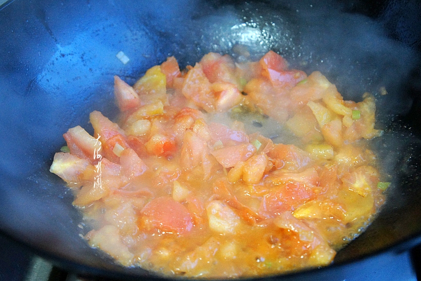 炒锅加入适量的油,爆香五香粉和毛葱碎,加入番茄炒至近似番茄酱,出来浓郁的汤汁为好