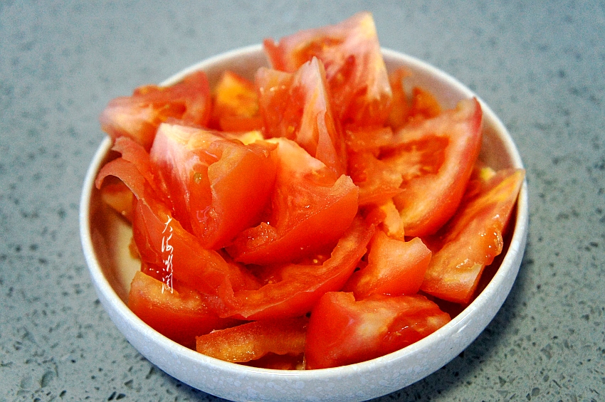 然后开始煮螺旋空心粉了,番茄在淡盐水中浸泡10分钟,反复清洗干净,切块。毛葱去皮洗净切碎,可以用洋葱,东北的毛葱特有味道,煮面比洋葱提味。