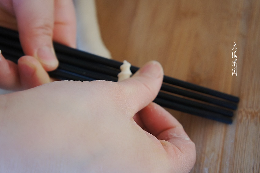 现在我们来做螺旋意粉,首先取4根筷子,并排按在面板上,取一个小面剂子,用拇指按在筷子上往下一碾,搓成空心,一个带花纹的空心卷就完成了,是不是很简单,无需特别的工具,4根筷子就能完成,看一遍你也会了吧。
