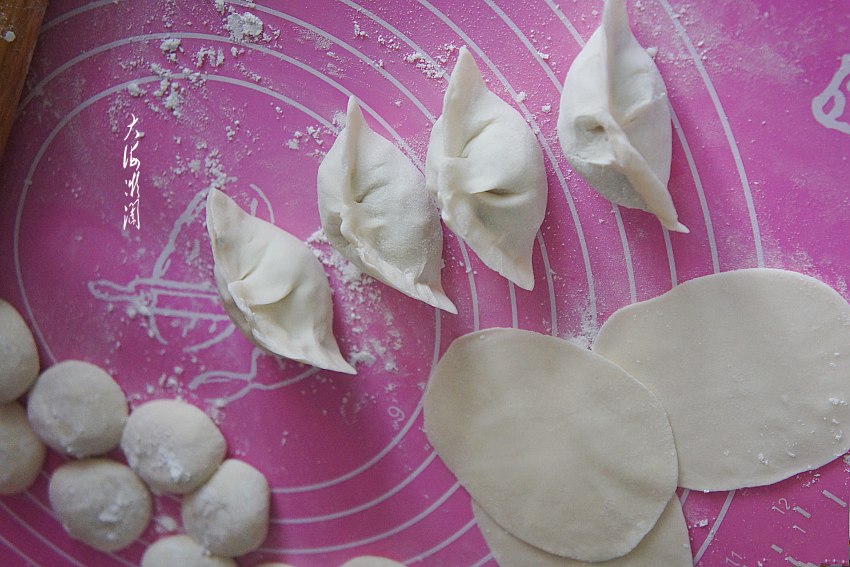 包饺子,将饧好的面团揉成长条,揪成均匀的小面剂子,擀成饼,包上馅,两手对捏就好了,最简单的包法,人人都会。