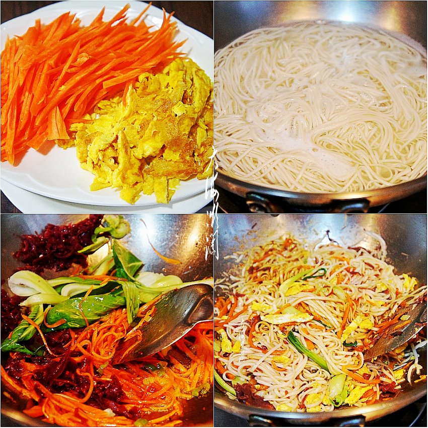 3、炒锅加入适量的油,爆香五香粉和葱,加入胡萝卜丝翻炒至变软。然后放入红椰菜和油菜条翻炒,最后加入控净水分的面条翻炒均匀。加入盐、白糖、胡椒粉、蚝油调味,喜欢的可以调一点香醋,根据自己喜欢的口味调吧。