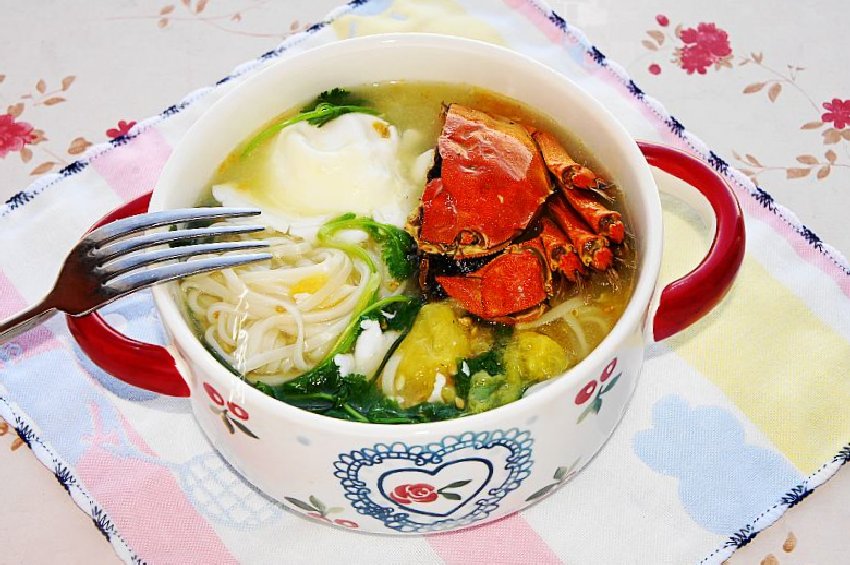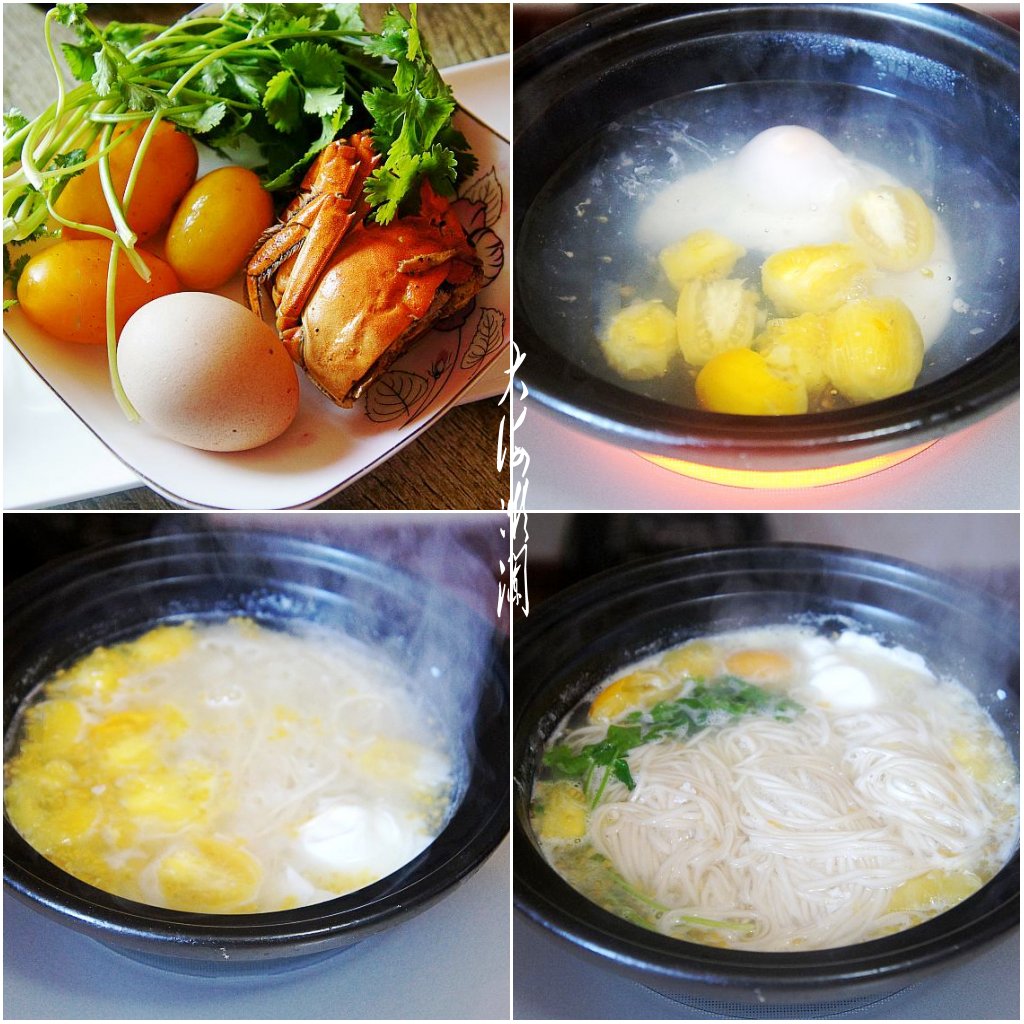 所需食材:挂面200g;鸡蛋1个;黄番茄3个;香菜适量,芥花籽橄榄油适量;大闸蟹半只;盐、胡椒粉、生抽各适量。