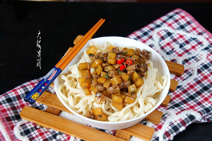 7、捞出面条过冷水,浇上提前做好肉丁土豆卤就OK了,还可以荷包一个鸡蛋,打卤面荷包蛋,是孩子们的最爱。
