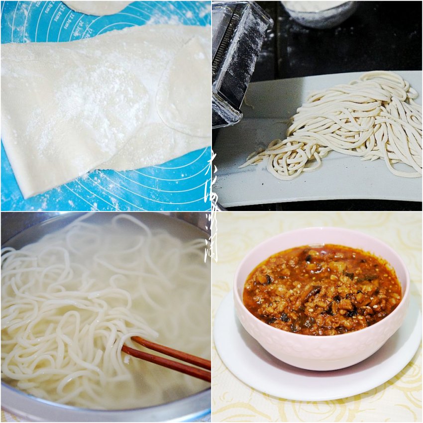 天热来一碗炸酱面,最过瘾了,面条可以是挂面,也可以买现成的手擀面,或者想我这样,用最简单的压面条机,自制一份手擀面都可以,炸个肉酱卤或者鸡蛋酱卤一拌,那叫一个爽!2碗才过瘾。