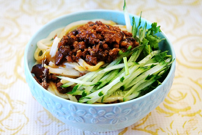 5、提前炸一锅香菇肉酱卤,面条出锅过冷水后捞出,撒点黄瓜丝和香菜碎,浇上香菇肉酱卤即可开餐了。