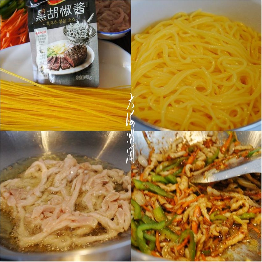 所需食材:意面300g;里脊肉100g;黑胡椒酱20g;胡萝卜1根;毛葱1个;青椒半个;油、盐、葱姜、料酒、淀粉各适量。