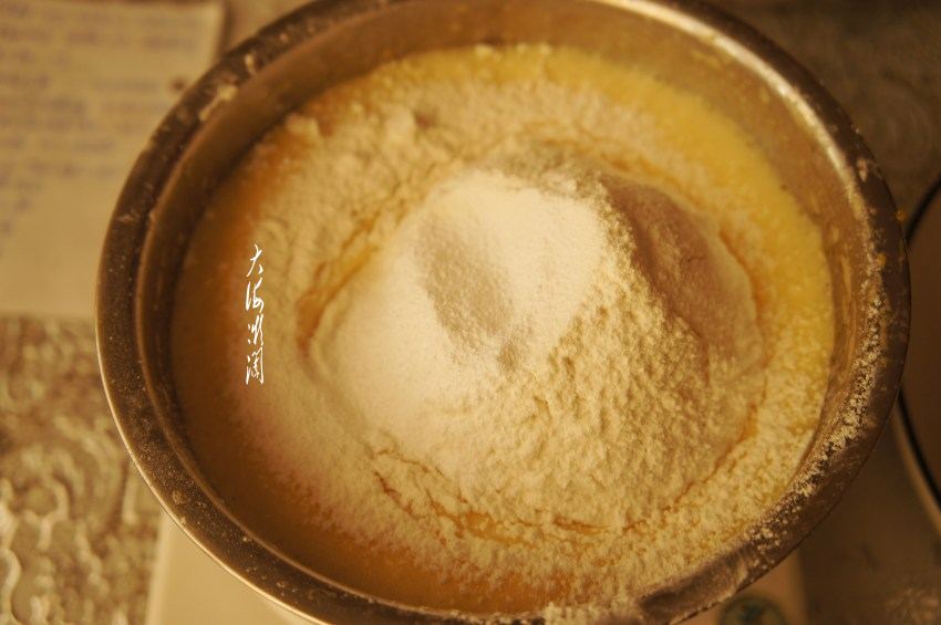 筛入低筋粉,加入泡打粉,切拌均匀。注意是切拌,而不是搅拌哈。