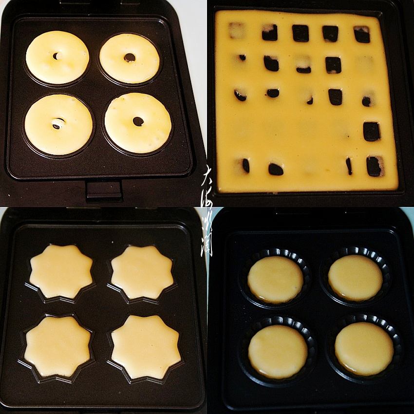 分别使用4种模具,做不同形状的小零食。为了减少重复程序,把4种小零食的做法放到一起,这样可以一目了然。裱花袋剪小口,取一种模具,放进东菱三明治早餐机,预热三分钟,挤入蛋糕糊,除了蛋挞皮,其他几种都设置8分钟,蛋挞皮5分钟即可。