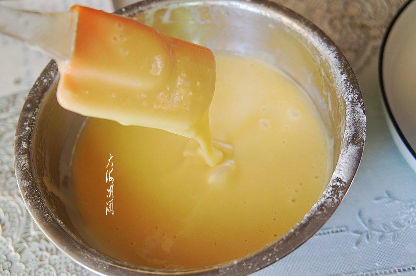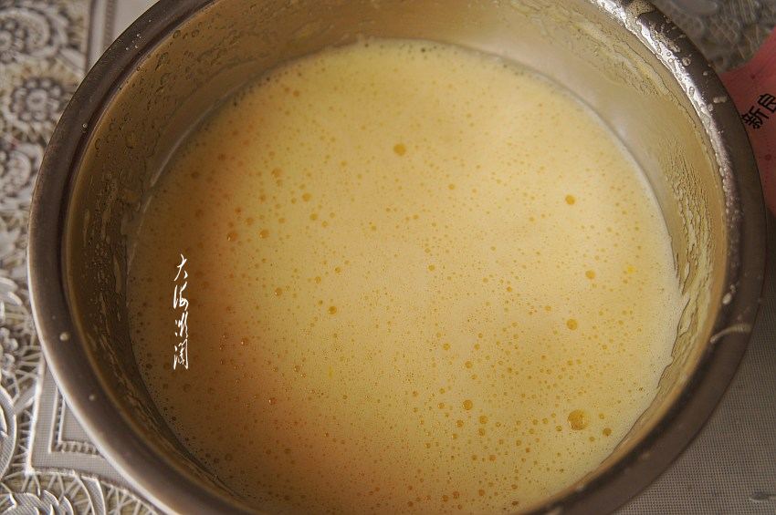 用打蛋器或者手动打蛋器将蛋液打发至起泡,蛋液变得浓稠,划之字不会马上消泡就好。