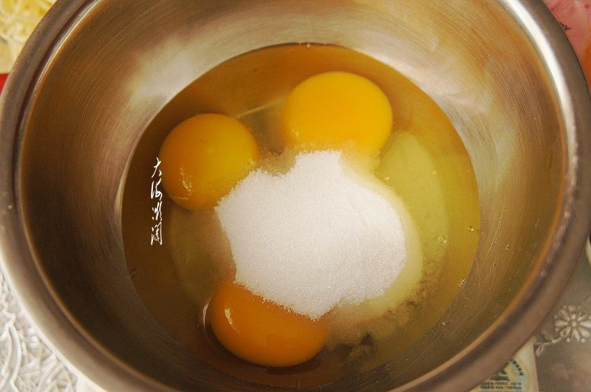 鸡蛋打散,不同于戚风蛋糕,无需蛋黄蛋白分离,所以这个做法非常简单。加入细砂糖。用糖的量可根据个人喜欢的口味调整。