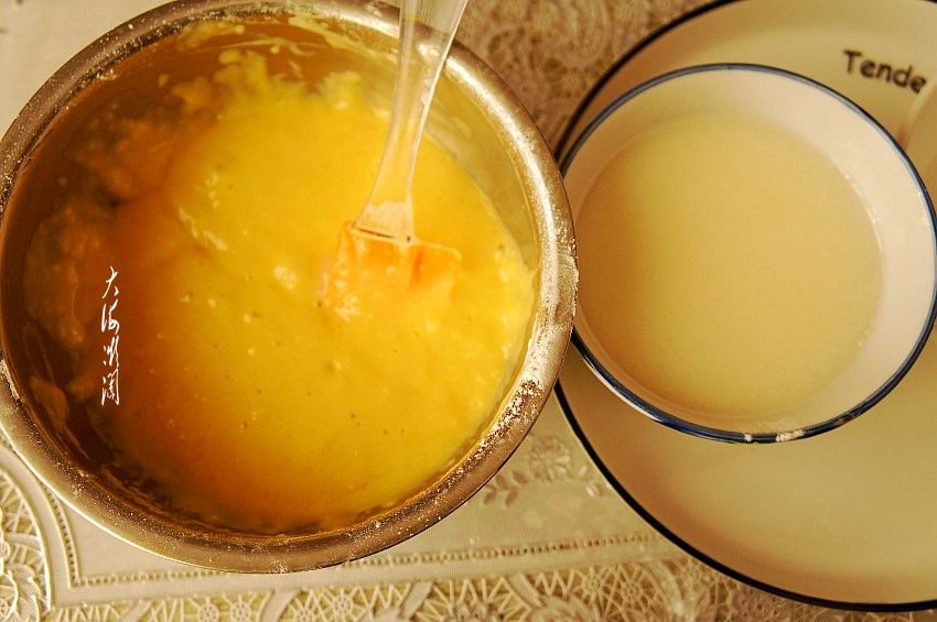 玉米油和牛奶混合,搅拌均匀,倒入面糊中。