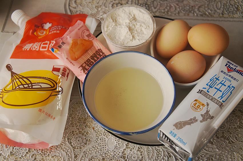 所需食材:低筋粉130g;鸡蛋3个;玉米油80g;牛奶45g;细砂糖70g;无铝泡打粉3g。