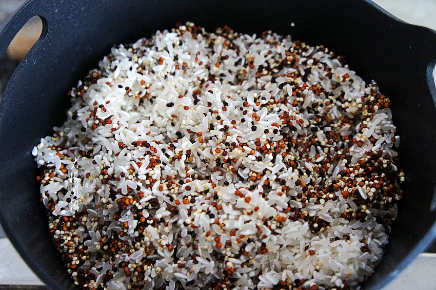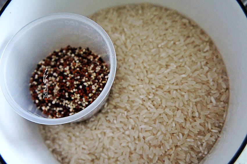 准备食材:今天用的大米是稻花香大米和三色藜麦米。这大米做出来的米饭的确好吃,口感好,粒粒晶莹。两杯大米半杯藜麦米,蒸出来一锅米饭非常棒。