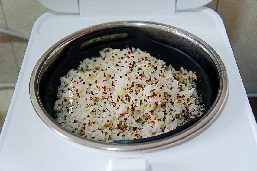 将淘洗干净的大米和浸泡好的三色藜麦米放入电饭煲的滤糖甑,加入硅胶垫,可防粘,容易清洗,也不影响米饭口感。