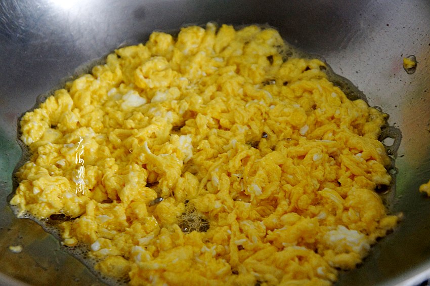 鸡蛋打散,加少许料酒去腥,搅拌均匀。炒锅加入适量多一点的油,拌馅时不用另加油了。油开倒入蛋液,迅速用筷子搅拌,越碎越好,然后取出备用。