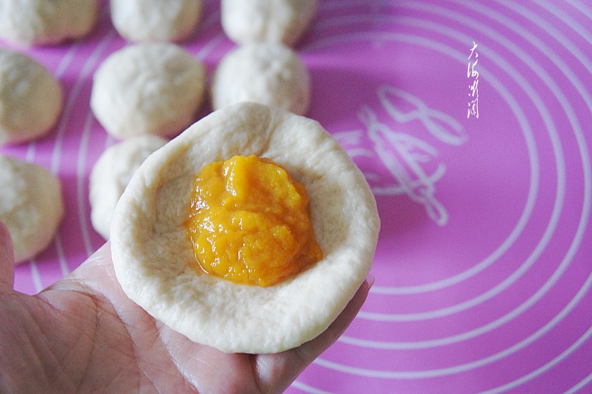取一个面剂子,擀成面饼,包上芒果馅,这个芒果酱是刚刚熬制的,做馅料我什么都没兑,纯正的果酱,味道香浓,如果感觉稀可以焙点糯米粉兑上团成团,更容易操作。