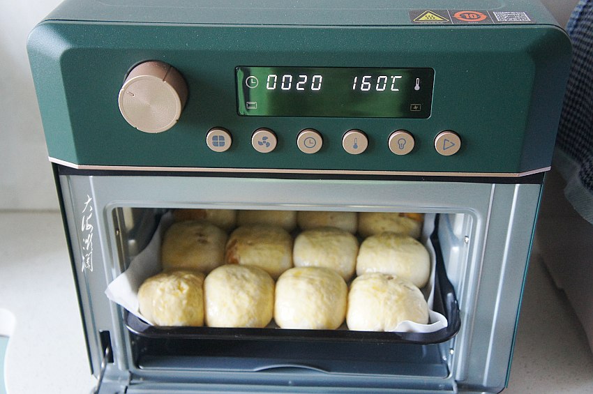 空气炸烤箱160度上下火中层烤20分钟,10分钟的时候发现已经上色很好了,于是后10分钟改成150度,颜色还好,看来以后可以用150度来烤。设备品牌不同,温度和时间都有差异,请根据自己的烤箱设置。