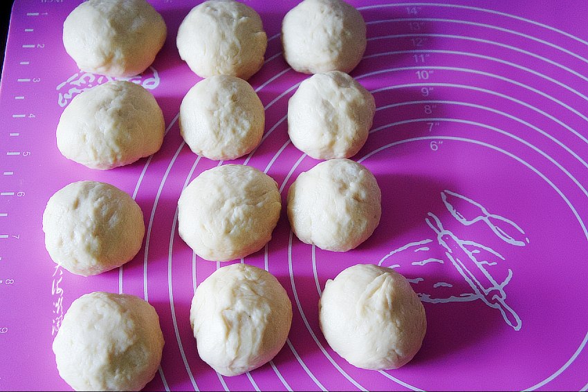 发酵好的面团从面包桶中取出,反复揉匀,排出气体,均匀的分成12个面剂子,盖上保鲜膜饧15分钟。