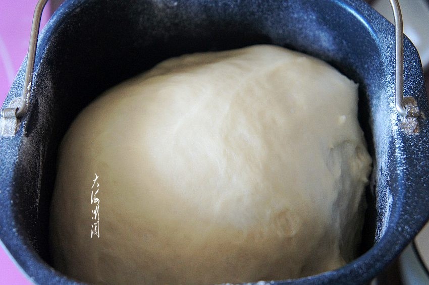将牛奶、蛋液、油等液体依次加入面包桶,加入盐和白糖,筛入面包粉,加入酵母,面包机启动两个和面程序,大约需要40分钟,然后启动发酵程序,时间是1小时30分钟。