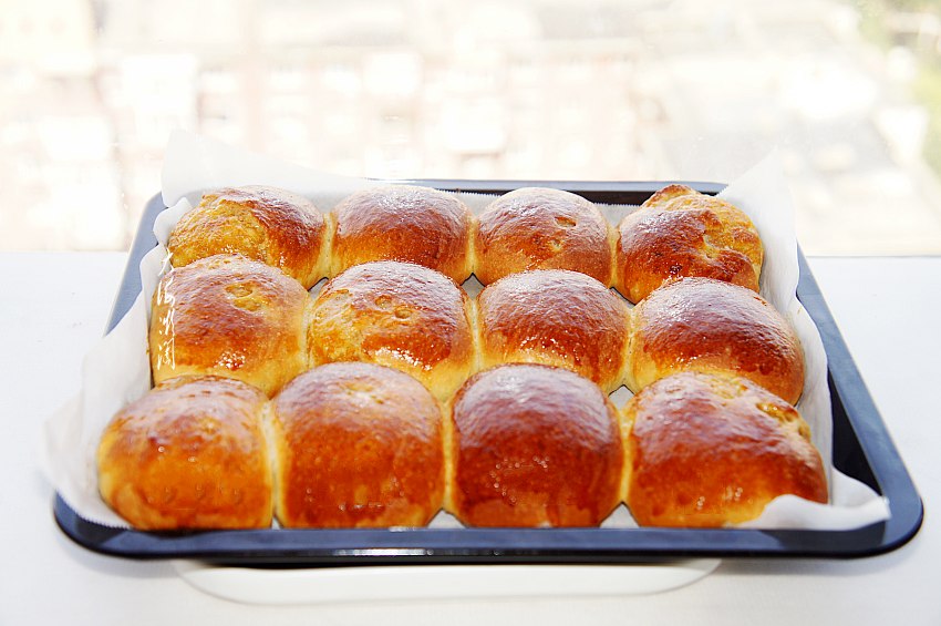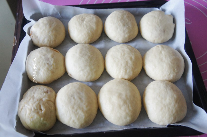 依此类推,完成12个面包的制作。烤盘铺上油纸,将做好的小面包码入烤盘。