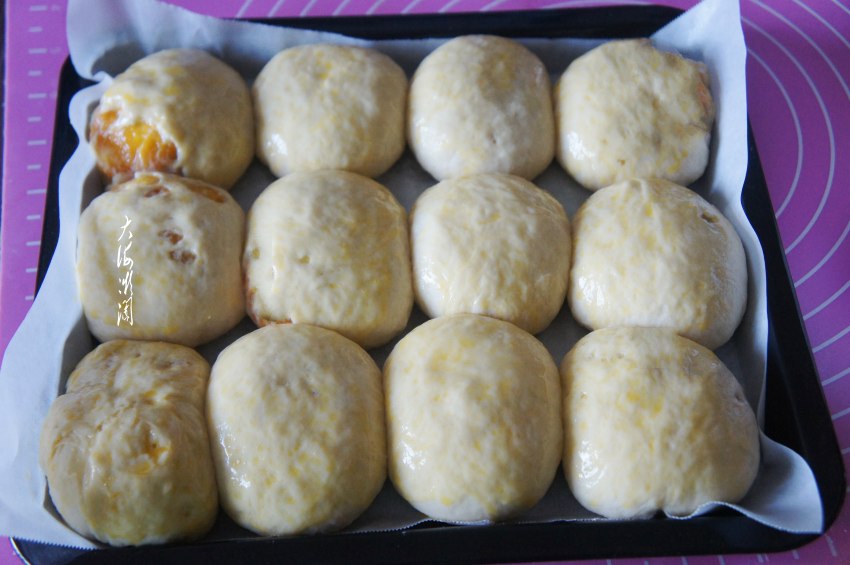 二发结束,取出烤盘,此时立即预热空气炸烤箱,160度预热5分钟。然后再给面包刷蛋黄液,馅料包多了,发后有撑破的哈,不过没关系,不影响口感。