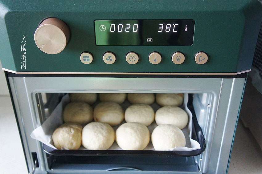 空气炸烤箱选择发酵功能,烤盘入烤箱二次发酵,38度设置发酵时间20分钟,夏季温度高,发酵快,我一边操作面包就一边长大,所以时间可以短一点,启动开关。