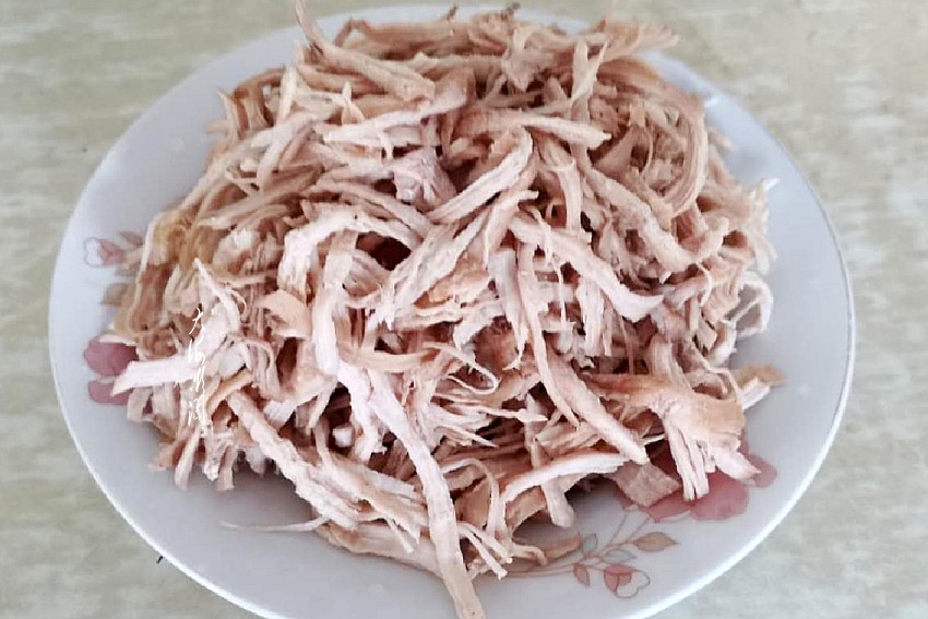 鸡胸肉洗净,锅内加入适量的水,加点葱姜,然后加入鸡胸肉煮熟后捞出晾凉,用擀面杖擀压松软,手撕成丝。