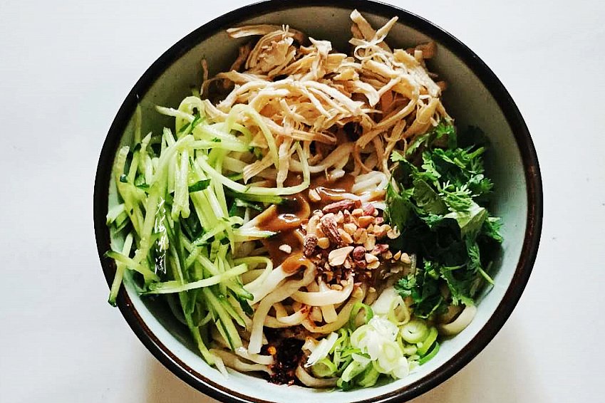 过冷水的面条捞出,控净水分,装入碗中,加入鸡肉丝、黄瓜丝、香菜、香葱,倒入调好的麻酱料汁。
